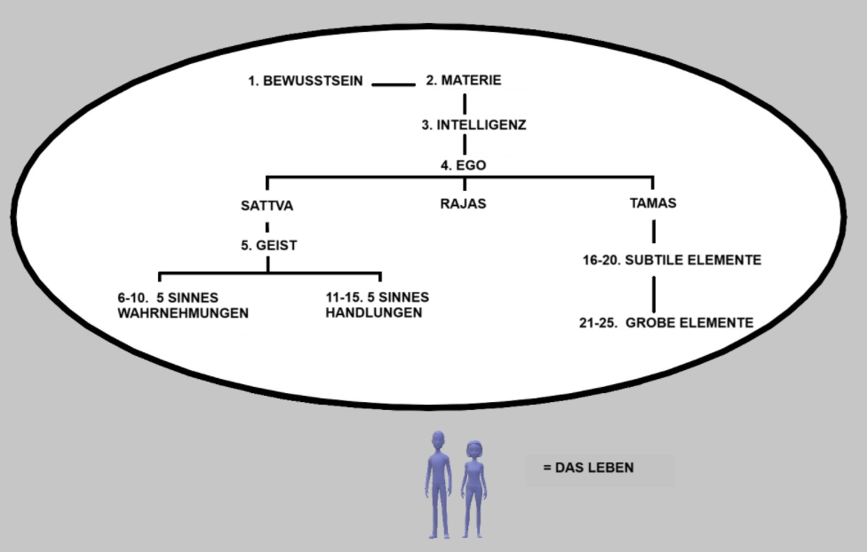 - Puruṣa (Bewusstsein): Ist das passive, reine, unveränderliche Bewusstsein (Seele, Selbst), ohne Handlungen, der unveränderliche Zeuge.