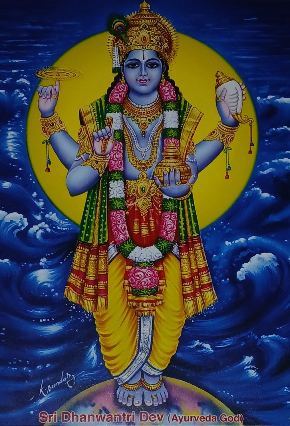 Dhanvantari gilt als Gott des Āyurveda und höchster Arzt unter den Göttern. Er erscheint in den Purāṇas und wird als Avatar von Vishnu verehrt.